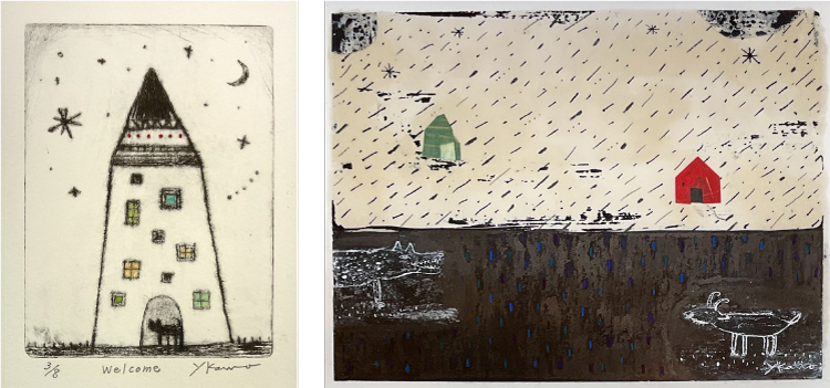 | 「Healing」 10.0×7.0cm | 「P-chan」 10.7×7.0cm ドライポイント、手彩色 2024年 ■5,500円(シート、税込) ● |